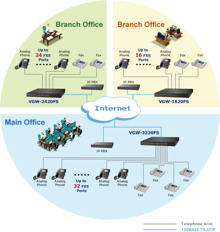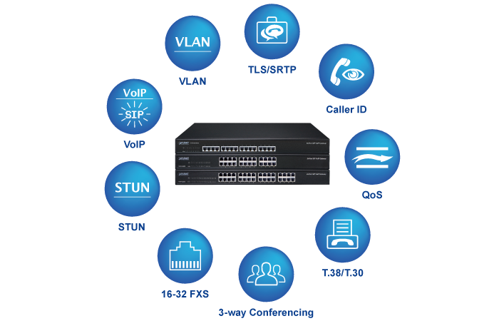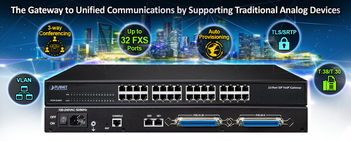 PLANET VGW-3220FS enterprise-class 32-port SIP VoIP Gateway provides added flexibility during migration to Unified Communications by supporting the traditional analog devices. These devices include analog phones, fax machines, modems, voicemail systems and speakerphones.