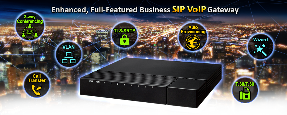 • specifications_tab: <table style="width:100%;" class="common_table_sky"><thead><tr><th colspan="2">Hardware</th></tr></thead><tbody><tr><td class="align-middle">WAN</td><td>1 x 10/100/1000BASE-T RJ45 port</td></tr><tr><td class="align-middle">LAN</td><td>1 x 10/100/1000BASE-T RJ45 port</td></tr><tr><td class="align-middle">Voice</td><td>8 x RJ11 connection (8 x Foreign eXchange Station)</td></tr><tr><td class="align-middle">Weight</td><td>300g</td></tr><tr><td class="align-middle">Dimensions (W x D x H)</td><td>194 x 110 x 28 mm</td></tr><tr><td class="align-middle">Power Requirements</td><td>100-240VAC, 50-60 Hz@DC12V 2A</td></tr><tr><td class="align-middle">Power Consumption</td><td>18W</td></tr></tbody><thead><tr><th colspan="2">Protocols and Standard</th></tr></thead><tbody><tr><td class="align-middle">FXS</td><td>Dial Mode: DTMF and Pulse <br /> Pulse: 10 and 20 PPS<br /> Caller ID: DTMF/FSK CLI Presentation<br /> Max. Cable Length: 3KM<br /> Reverse Polarity<br /> Programmable Call Progress Tone</td></tr><tr><td class="align-middle">Voice & Fax</td><td>G.711A/U law, G.723.1, G.729A/B,G.726 and iLBC<br /> Silence Suppression <br /> Comfort Noise Generation (CNG)<br /> Voice Activity Detection(VAD)<br /> Echo Cancellation (G.168), with up to 128ms <br /> Adaptive (Dynamic) Jitter Buffer<br /> Hook Flash<br /> Programmable Gain Control<br /> T.38/Pass-through<br /> Modem/POS<br /> DTMF mode: Signal/RFC2833/INBAND<br /> VLAN 802.1P and 802.1Q<br /> Layer 3 QoS and DiffServ</td></tr><tr><td class="align-middle">VoIP</td><td>Protocol: SIP v2.0 (UDP/TCP), RFC3261, SDP, RTP(RFC2833), RFC3262, 3263, 3264, 3265, 3515, 2976, 3311<br /> RTP/RTCP, RFC2198, 1889<br /> RFC4028 Session Timer<br /> RFC3266 IPv6 in SDP<br /> RFC2806 TEL URI<br /> RFC3581 NAT and rport<br /> Primary/Backup SIP Server<br /> Outbound Proxy<br /> DNS SRV/ A Query/NATPR Query<br /> SIP Trunk<br /> Early Media/Early Answer<br /> NAT: STUN, Static/Dynamic NAT</td></tr><tr><td class="align-middle">Supplementary Service</td><td>Call Waiting<br /> Blind Transfer <br /> Attend Transfer<br /> Call Forward on Busy<br /> Call Forward on No Reply<br /> Unconditional Call Forward<br /> Warm/Immediately Hotline<br /> Call Hold <br /> Do-not-disturb<br /> 3-way Conferencing<br /> Message Waiting Indicator</td></tr><tr><td class="align-middle">Software Features</td><td>Hunting Group<br /> Web ACL<br /> Telnet ACL<br /> Action URL<br /> PPPoE/IPv4/IPv6<br /> Digitmap<br /> Bandwidth Optimization<br /> Routing Rules based Prefixes<br /> Caller/Called Number Manipulation</td></tr><tr><td class="align-middle">Management</td><td>SNMP v1/v2/v3<br /> TR069<br /> Auto Provisioning<br /> Web/Telnet<br /> Configuration Backup/Restore<br /> Firmware Upgrade via Web<br /> CDR<br /> Syslog<br /> Ping and Tracert Test<br /> Network Capture<br /> Outward Test (GR909)<br /> NTP and Daylight Saving Time<br /> IVR local Maintenance</td></tr></tbody><thead><tr><th colspan="2">Environments</th></tr></thead><tbody><tr><td class="align-middle">Operating Temperature</td><td>0 ~ 45 degrees C</td></tr><tr><td class="align-middle">Storage Temperature</td><td>-20 ~ 80 degrees C</td></tr><tr><td class="align-middle">Operating Humidity</td><td>10%~90% relative humidity, non-condensing</td></tr><tr><td class="align-middle">Emission</td><td>CE, FCC</td></tr></tbody></table>