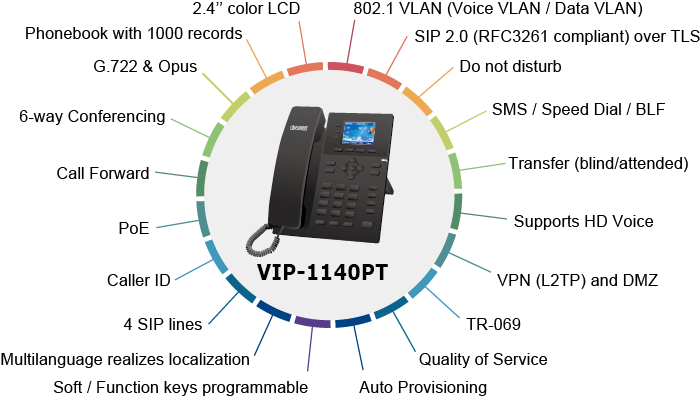 The VIP-1140PT allows you to make digital phone calls utilizing existing broadband networks in homes and offices without installing new analog connections (e.g. copper wires). Its 2.4-inch wide-viewing-angle color display with a resolution of 320 x 240 pixels offers a clear depiction of caller’s information as well as supports up to 19 languages. Compliance with IEEE 802.3af PoE standards makes deployment convenient and flexible. In addition, the advanced speaker/microphone and the dedicated Digital Signal Processor assures superior audio quality.