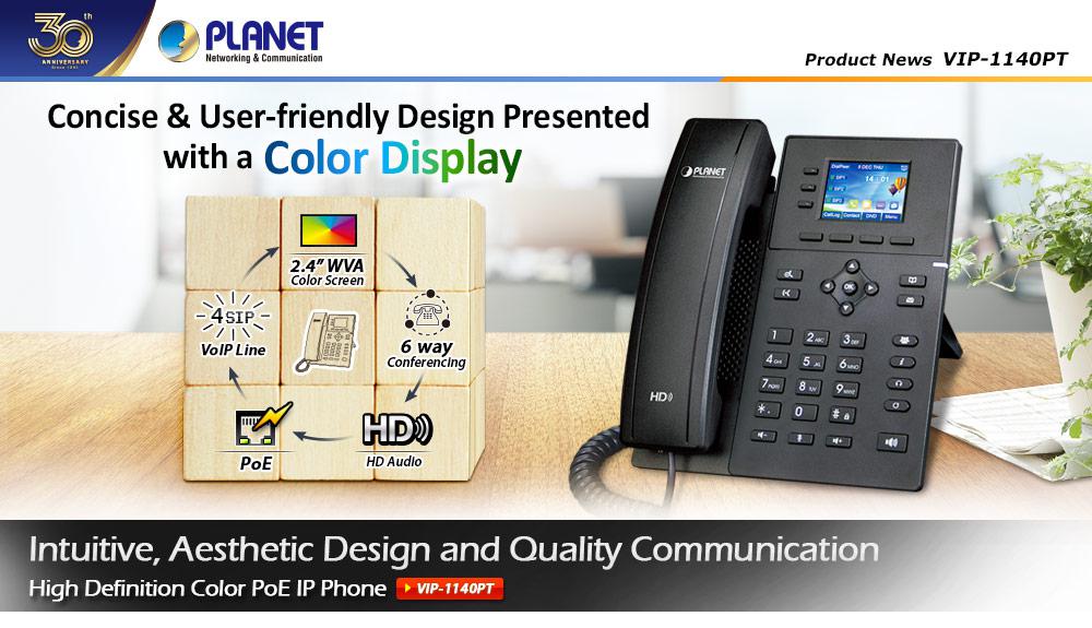 PLANET’s VIP-1140PT is a 4-line SIP VoIP phone set featuring color display, user-friendly, aesthetic user interface design and HD voices.