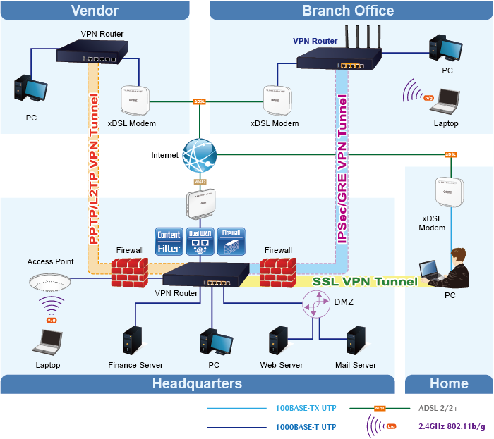 The VR-300W6A and VR-300PW6A provide complete data security and privacy for accessing and exchanging most sensitive data, built-in IPSec VPN function with DES/3DES/AES encryption and MD5/SHA-1/SHA-256/SHA-384/SHA-512 authentication, and GRE, SSL, PPTP and L2TP server mechanism. The full VPN capability in the VR-300PW6A makes the connection secure, more flexible, and more capable.