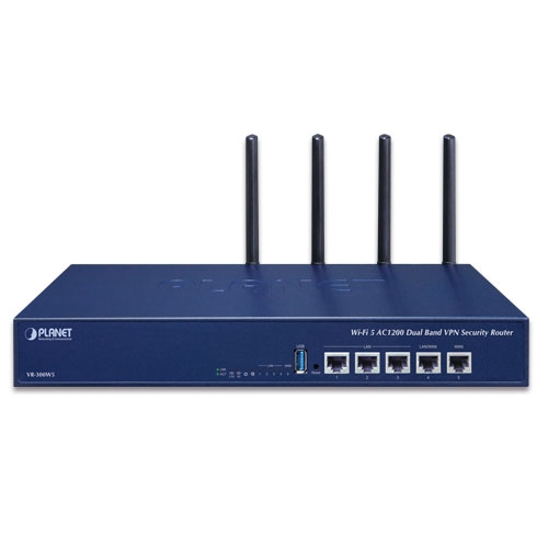 • product_editor_4421_tab_content: <span style="color: #5070ab;"><strong>Highlights</strong></span> <ul> <li>Dual-WAN failover and Dual-WAN load balancing</li> <li>Complies with IEEE 802.11ac and IEEE 802.11a/b/g/n standards</li> <li>SSL VPN and robust hybrid VPN (IPSec/PPTP/L2TP over IPSec)</li> <li>Stateful Packet Inspection (SPI) firewall and content filtering</li> <li>Blocks DoS/DDOS attack, port range forwarding</li> <li>High Availability, AP Controller, Captive Portal and RADIUS</li> <li>IPv6, SNMP, PLANET DDNS and Universal Network Management System</li> </ul>   <span style="color: #5070ab;"><strong>Hardware</strong></span> <ul> <li>5 10/100/1000BASE-T RJ45 ports</li> <li>1 undefined Ethernet port (LAN/WAN) for Dual-WAN function</li> <li>1 USB 3.0 port for system configuration backup and restore</li> <li>Reset button and fanless design</li> <li>Desktop installation or rack mounting</li> </ul>   <span style="color: #5070ab;"><strong>RF Interface Characteristics</strong></span> <ul> <li>Features 2.4GHz (802.11b/g/n) and 5GHz (802.11a/n/ac) concurrent dual band for more efficiency of carrying high load traffic</li> <li>2T2R MIMO technology for enhanced throughput and coverage</li> <li>Provides multiple adjustable transmit power control</li> <li>High speed up to 1.2Gbps (300Mbps for 2.4GHz + 867Mbps for 5GHz) wireless data rate</li> </ul>   <span style="color: #5070ab;"><strong>IP Routing Feature</strong></span> <ul> <li>Static Route</li> <li>Dynamic Route</li> <li>OSPF</li> </ul>   <span style="color: #5070ab;"><strong>Firewall Security</strong></span> <ul> <li>Cybersecurity</li> <li>Stateful Packet Inspection (SPI) firewall</li> <li>Blocks DoS/DDoS attack</li> <li>Content Filtering</li> <li>MAC Filtering and IP Filtering</li> <li>NAT ALGs (Application Layer Gateway)</li> <li>Blocks SYN/ICMP Flooding</li> </ul>   <span style="color: #5070ab;"><strong>VPN Features</strong></span> <ul> <li>IPSec/Remote Server (Net-to-Net, Host-to-Net), GRE, PPTP Server, L2TP Server, SSL Server/Client (Open VPN)</li> <li>Max. Connection Tunnel Entries: 60 VPN tunnels,</li> <li>Encryption methods: DES, 3DES, AES, AES-128/192/256</li> <li>Authentication methods: MD5, SHA-1, SHA-256, SHA-384, SHA-512</li> </ul>   <span style="color: #5070ab;"><strong>Networking</strong></span> <ul> <li>Outbound load balancing</li> <li>Failover for dual-WAN</li> <li>High Availability</li> <li>Captive Portal</li> <li>RADIUS Server/Client</li> <li>Static IP/PPPoE/DHCP client for WAN</li> <li>DHCP server/NTP client for LAN</li> <li>Protocols: TCP/IP, UDP, ARP, IPv4, IPv6</li> <li>Port forwarding, QoS, DMZ, IGMP, UPnP, SNMPv1, v2c, v3</li> <li>MAC address clone</li> <li>DDNS: PLANET DDNS, Easy DDNS, DynDNS and No-IP</li> </ul>   <span style="color: #5070ab;"><strong>Others</strong></span> <ul> <li>Setup wizard</li> <li>Dashboard for real-time system overview</li> <li>Supported access by HTTP or HTTPS</li> <li>Auto reboot</li> <li>PLANET NMS System and Smart Discovery Utility for deployment management</li> <li>Planet CloudViewer App for real-time monitoring</li> </ul>