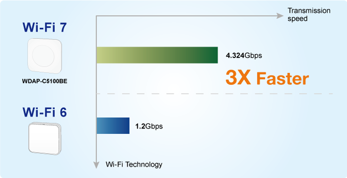 The WDAP-C5100BE supports up to 160 MHz channel bandwidth, a key feature of Wi-Fi 7 that doubles the available channel width compared to Wi-Fi 6E. Its peak transmission rate of 5100 Mbps is designed for commercial environments, delivering stable performance, higher efficiency, and reliable operation.