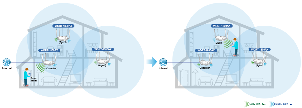 As OFDMA, a multi-user version of OFDM, enables the concurrent AP to communicate (uplink and downlink) with multiple clients by assigning subsets of subcarriers called resource units (RUs) to the individual clients. With EasyMesh and Seamless Roaming technologies, it provides a better Wi-Fi user experience, reducing the likelihood of users turning off Wi-Fi and putting more load on the cellular network. These technologies also can solve Wi-Fi congestion issues in open workspaces and conference rooms. The WDRT-1800AX can offer more powerful throughput coverage of up to 64 client users.