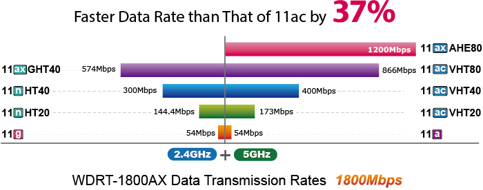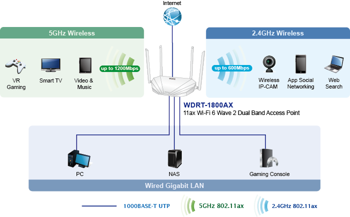 The WDRT-1800AX, suitable for home multi-device streaming connection, smart home and other environments, provides better speed and multi-installation connectivity for high-efficiency networking. Equipped with the next-generation Wi-Fi 6 (802.11ax) wireless network standard, the total bandwidth reaches 1800Mbps, and the 4-stream transmission technology improves the transmission efficiency of multiple devices, making AR/VR/IoT applications smoother.