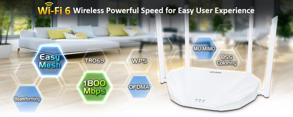 PLANET WDRT-1800AX Dual Band 802.11ax 1800Mbps Wireless Gigabit Router, supporting MU-MIMO, Wave 2.0, OFDMA and EasyMesh technology, provides a maximum wireless speed of 1200Mbps in the 5GHz band and 600Mbps in the 2.4GHz band. The maximum number of client users is up to 64, ensuring more secure and robust connectivity with the adoption of Wi-Fi 6 technology.