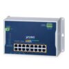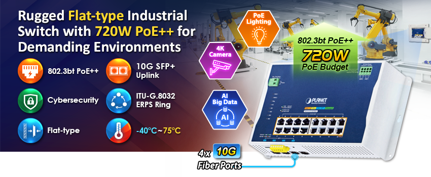 The PLANET WGS-5215-16UP4X is an industrial wall-mount PoE++ managed switch designed to enhance network reliability in industrial environments. It features PLANET’s intelligent PoE management functions that maximize system availability and operational efficiency. The switch provides IPv6/IPv4 dual-stack management, built-in Layer 3 static routing capability, and a powerful L2+/L4 Gigabit switching engine along with 16 10/100/1000BASE-T ports featuring 95-watt PoE, plus four additional 100/1000/2500/10GBASE-X SFP ports.