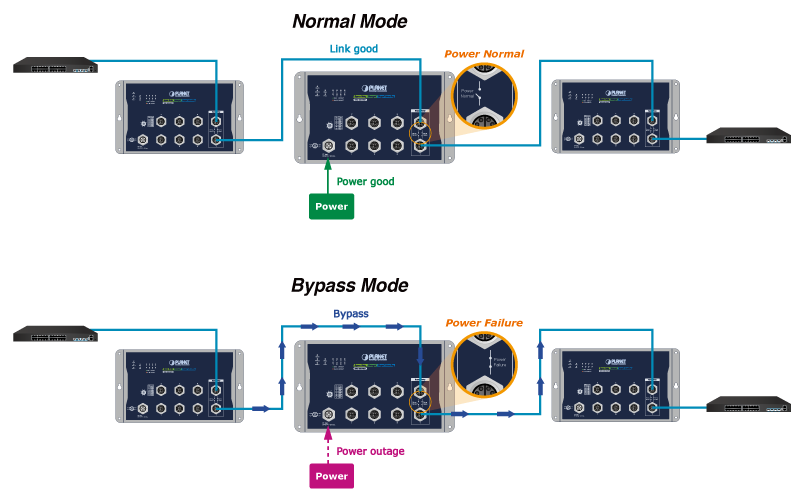 Bypass relay is set to bypass the failed switch to the next normal switch to prevent the network from power loss. The WGS-5225-8MT supports the bypass relay function on the one pair of Gigabit ports. When the switch is operating normally, the Gigabit ports operate in the same way as the other ports, processing and forwarding Ethernet packets. Bypass relay ports allow network traffic to continue to flow in the event of a power outage. It also can go back to the normal mode when power is back and the switch is completely booting up to avoid another network loss.