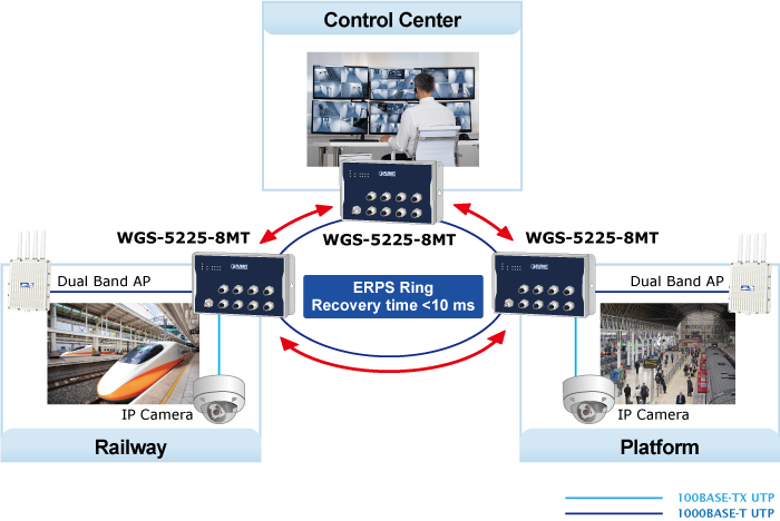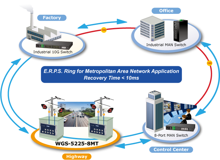 The WGS-5225-8MT supports redundant ring technology and features strong, rapid self-recovery capability to prevent interruptions and external intrusions. It incorporates advanced ITU-T G.8032 ERPS (Ethernet Ring Protection Switching) technology, Spanning Tree Protocol (802.1s MSTP), and redundant power input system into customer’s industrial automation network to enhance system reliability and uptime in harsh factory environments. In a certain simple Ring network, the recovery time of data link can be as fast as 10ms.