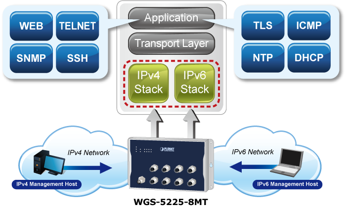 Supporting both IPv6 and IPv4 protocols, the WGS-5225-8MT helps the SMBs to step in the IPv6 era with the lowest investment as its network facilities need not be replaced or overhauled if the IPv6 edge network is set up.