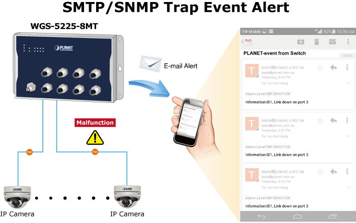 The WGS-5225-8MT provides event alert function through SMTP email and SNMP trap function to help to diagnose the abnormal device owing to whether or not there is a break of the network connection, or the rebooting response.