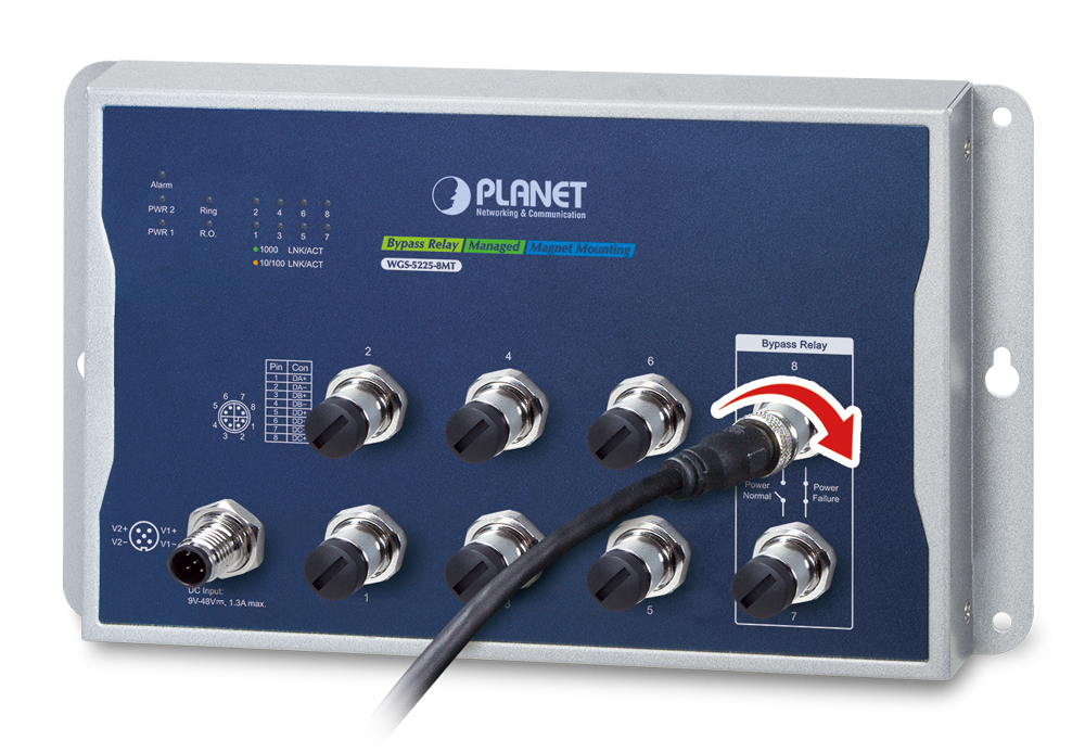 PLANET WGS-5225-8MT managed switch offers eight 10/100/1000BASE-T M12 ports and is housed in an IP40-rated enclosure with redundant 9-48 VDC power inputs. Designed to be deployed in the industrial environments, the WGS-5225-8MT offers wire-speed throughput, shock and vibration proofing, and a wide -40° to 75°C operating temperature range.