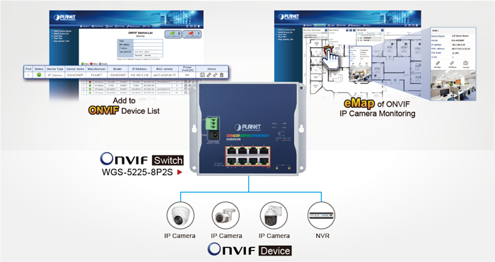 PLANET has newly developed an awesome feature — ONVIF Support — which is specifically designed for co-operating with video IP surveillances. From the WGS-5225-8P2S’s GUI, you just need one click to search and show all of the ONVIF devices via network application. In addition, you can upload floor images to the switch and can remotely monitor or inspect an assembly line. Moreover, you can get real-time surveillance information and online/offline status; the PoE reboot can be controlled from the GUI.