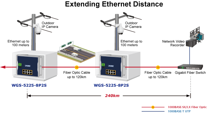 The two SFP slots built in the WGS-5225-8P2S support SFP auto-detection and triple speed as it features 100BASE-FX,1000BASE-SX/LX and 2500BASE SFP (Small Form-factor Pluggable) fiber transceivers to uplink to backbone switch and monitoring center in long distance. The distance can be extended from 300 meters to 2 kilometers (multi-mode fiber) and to 10/20/40/60/80/120 kilometers (single-mode fiber or WDM fiber). They are well suited for applications within the enterprise data centers and distributions.