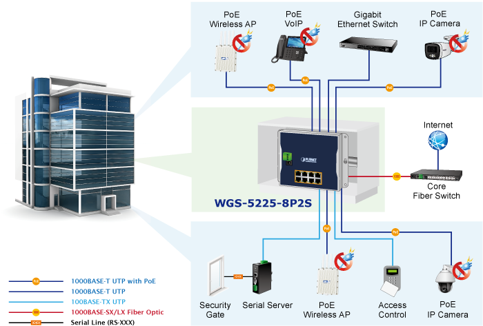 Designed to be installed in a wall enclosure or simply mounted on a wall in any convenient location, PLANET WGS-5225-8P2S, an innovative Industrial 8-port 10/100/1000T 802.3at PoE + 2-port 1G/2.5G SFP Wall-mounted Managed Switch, features PLANET intelligent PoE functions to improve the availability of industrial applications. It offers IPv6/IPv4 dual stack management, intelligent Layer 2 and Layer 4 management functions, and user-friendly interface, with a total power budget of up to 240 watts for different kinds of PoE applications. Featuring ultra networking speed and operating temperature ranging from -40 to 75 degrees C in a compact but rugged IP30 metal housing, the WGS-5225-8P2S is an ideal solution to meet the demand for the following network applications: