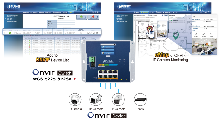 PLANET has newly developed an awesome feature — ONVIF Support — which is specifically designed for co-operating with video IP surveillances. From the WGS-5225-8P2SV’s GUI, you just need one click to search and show all of the ONVIF devices via network application. In addition, you can upload floor images to the switch and can remotely monitor or inspect an assembly line. Moreover, you can get real-time surveillance information and online/offline status; the PoE reboot can be controlled from the GUI.