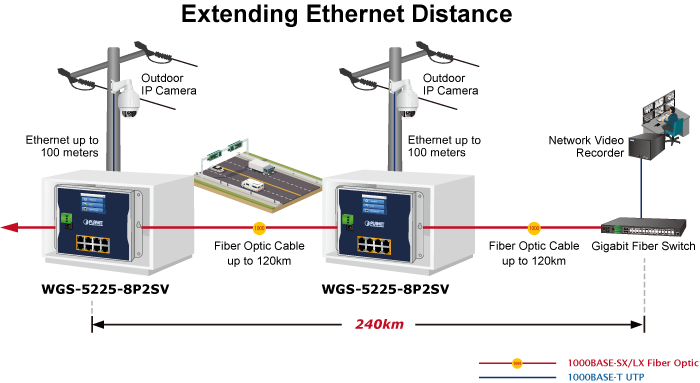 The two SFP slots built in the WGS-5225-8P2SV support SFP auto-detection and triple speed as it features 100BASE-FX, 1000BASE-SX/LX and 2500BASE SFP (Small Form-factor Pluggable) fiber transceivers to uplink to backbone switch and monitoring center in long distance. The distance can be extended from 300 meters to 2 kilometers (multi-mode fiber) and to 10/20/40/60/80/120 kilometers (single-mode fiber or WDM fiber). They are well suited for applications within the enterprise data centers and distributions.