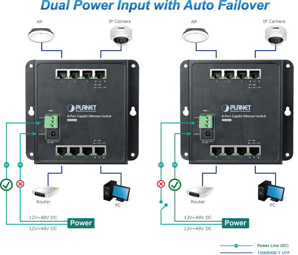 The WGS-803 features a strong dual power input system (12V~48V DC) incorporated into customer’s automation network to enhance system reliability and uptime. In the example below, when the 3-pin terminal block fails to work, the hardware failover function will be activated automatically to keep powering the WGS-803 via the DC plug power alternatively without any loss of operation.