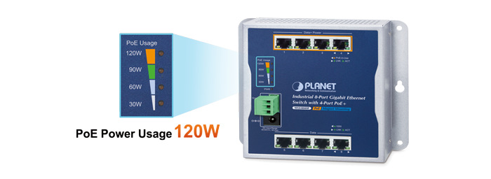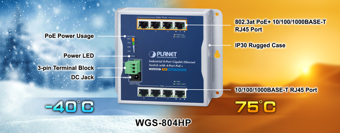 Designed to be installed in a wall enclosure or simply mounted at any convenient location on a wall, PLANET WGS-804HP is an innovative, wall-mounted industrial 8-port Gigabit Ethernet Switch with 4-port 802.3af/802.3at Power over Ethernet. It comes in a compact but rugged IP30 metal housing. Featuring a total PoE budget of 120 watts, ultra networking speed and operating temperature ranging from -40 to 75 degrees C, the WGS-804HP is an ideal solution to meeting the demand for sufficient PoE power for the following network applications.