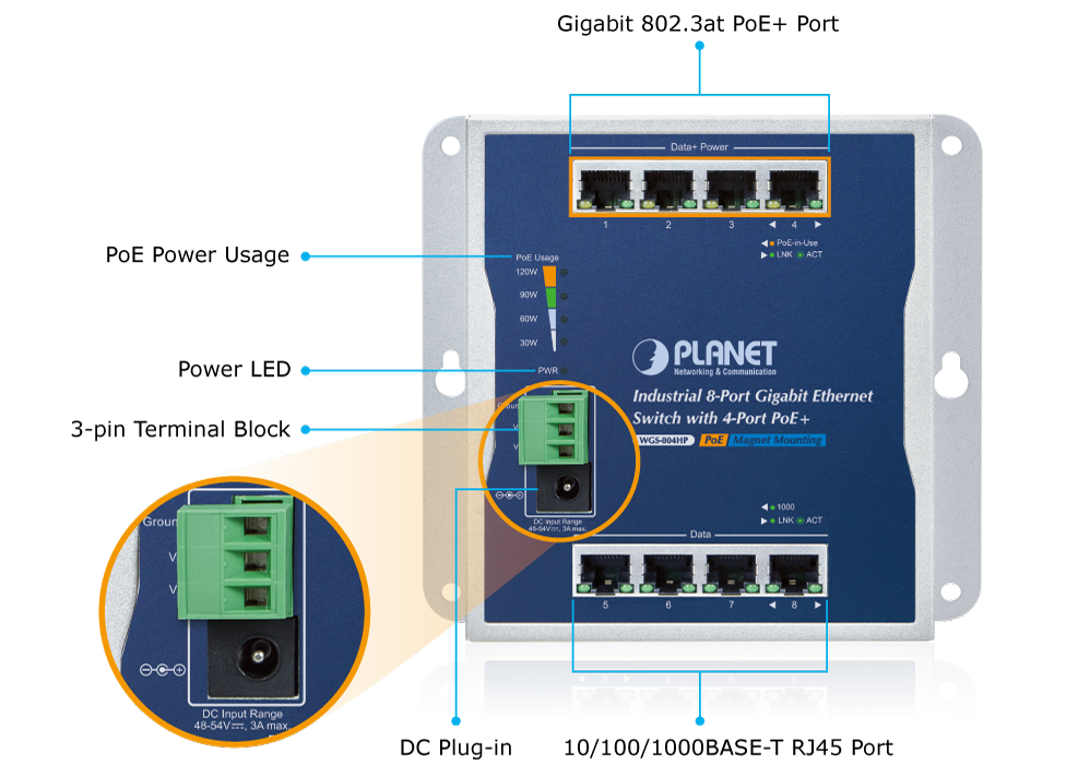 The WGS-804HP is specially designed to be installed in a narrow environment, such as wall enclosure. The compact, flat and wall-mounted design fits easily in any space-limited location. It adopts the user-friendly “Front Access” design, making the installing, cable wiring, LED monitoring and maintenance of the WGS-804HP placed in an enclosure very convenient for technicians. The WGS-804HP can be installed by fixed wall mounting, magnetic wall mounting or DIN rail, thereby making its usability more flexible.