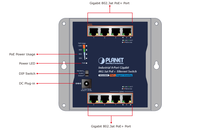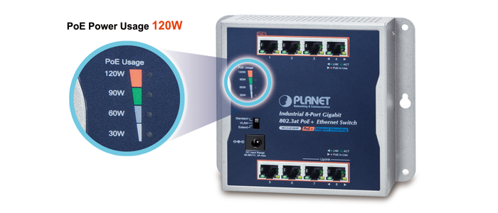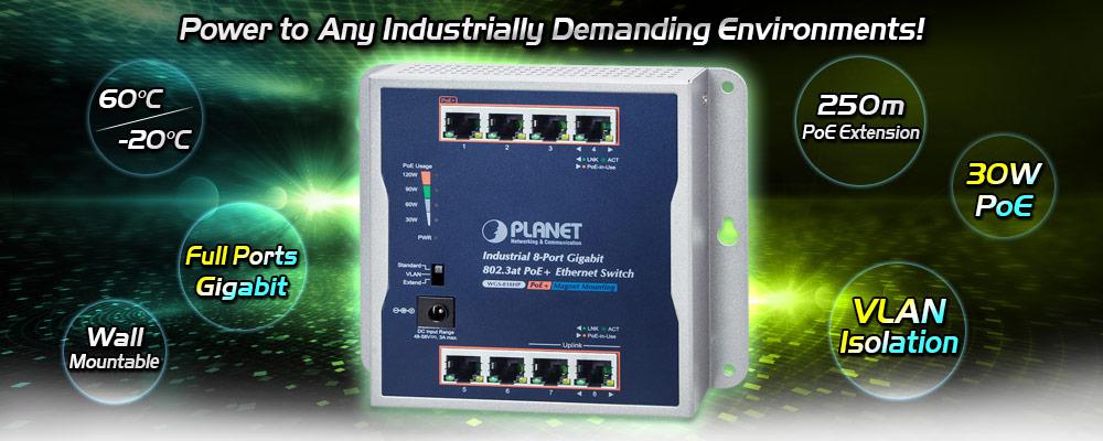 Designed to be installed in a wall enclosure or simply mounted at any convenient location on a wall, PLANET WGS-818HP is innovative, wall-mounted industrial 8-port Gigabit Ethernet Switches with 8-port 802.3at Power over Ethernet Plus injector. They come in a compact but rugged IP30 metal housing. Featuring a total PoE budget of 60/120 watts, ultra networking speed and operating temperature ranging from -20 to 60 degrees C, the WGS-818HP is ideal solutions to meet the demand for sufficient PoE power for the following network applications.