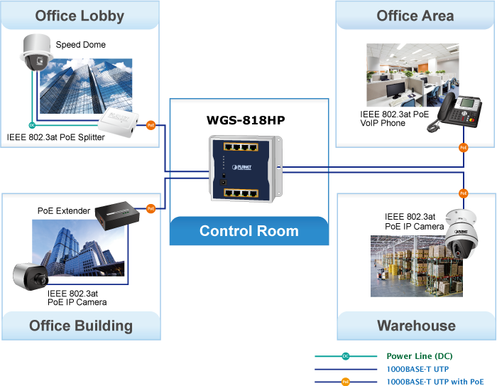 Carrying both Ethernet data and power simultaneously, the WGS-818HP reduces cabling requirements and eliminates the need for dedicated electrical outlets on the wall, ceiling or any unreachable place. It helps users to utilize just one Ethernet cable to install and deploy IP camera, wireless AP or VoIP phone more efficiently and cost-effectively.