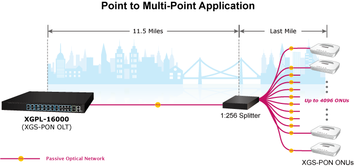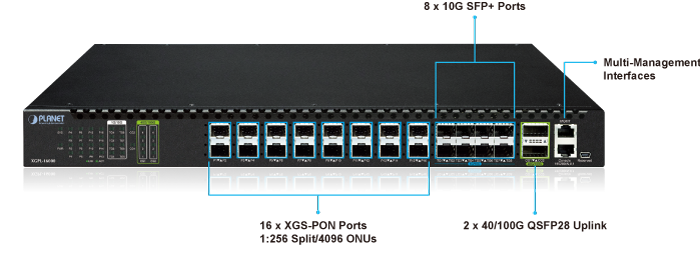 • applications_tab: <strong>Flexible 10G XGS-PON Solution for FTTH and Enterprise Applications</strong> Designed for both high-density residential areas and multi-building commercial deployments, the XGPL-16000 offers a high-capacity, carrier-grade fiber access solution. Each of its 16 XGS-PON ports supports a 1:256 split ratio, enabling connection of up to 4096 ONUs through a single chassis. Equipped with 100G uplink capability, the XGPL-16000 ensures reliable, high-throughput backhaul for a wide range of services—ranging from 4K/8K video streaming, IPTV, and VoIP for FTTH users, to IP surveillance, secure data access, and seamless enterprise connectivity in business environments. Its high scalability and symmetric 10Gbps bandwidth make it the ideal solution for ISPs, system integrators, and enterprises looking to deploy robust next-generation fiber networks. <img class="img-fluid aligncenter" src="https://planet.com.tw/storage/products/49845/XGPL-16000-3.png" alt="" width="700" height="503" />   <img class="img-fluid aligncenter" src="https://planet.com.tw/storage/products/49845/XGPL-16000-4.png" alt="" width="700" height="598" />