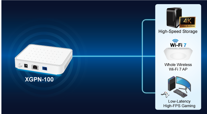 As modern businesses and households demand multi-gigabit connectivity, the XGPN-100 provides a 10G RJ45 port that supports full 10GbE speeds. This allows users to connect directly to high-speed networking equipment, such as NAS, gaming consoles, and external 802.11ax (Wi-Fi 6) or future 802.11be (Wi-Fi 7) access points via Ethernet, delivering superior data transmission speeds and signal quality.