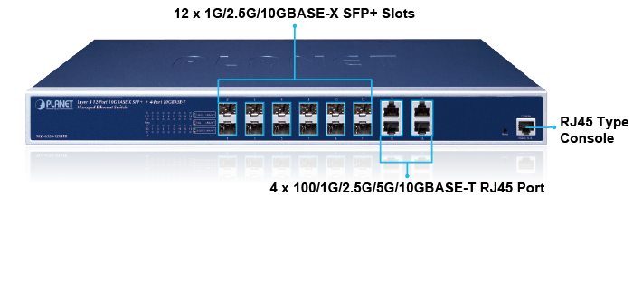 PLANET XGS-6320-12X4TR is a fully-managed all-port 10Gbps Ethernet switch designed for the demand of high bandwidth for advanced network equipment, such as Wi-Fi 6/6E wireless AP, NAS, workstation and those with 10Gbps fiber or copper interfaces. It features 4 10GBASE-T copper ports and 12 10GBASE-X SFP+ fiber ports that are flexibly designed to extend the connection distance.