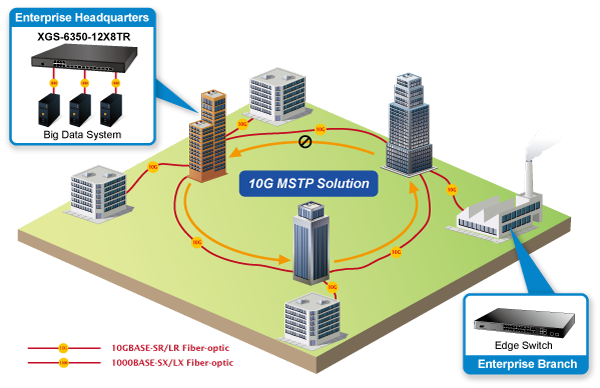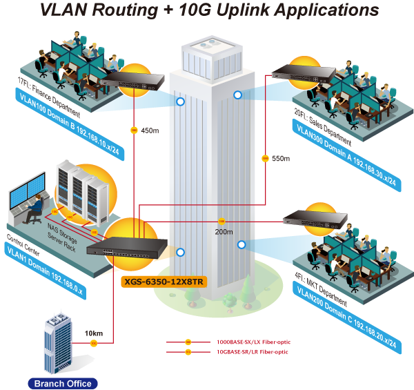 The XGS-6350-12X8TR provides eight 100/1000Mbps Ethernet ports and twelve 1/10Gbps SFP+ Fiber ports. Each of the SFP+ slots supports Dual Speed, 10GBASE-SR/LR or 1000BASE-SX/LX. Therefore, the administrator can flexibly choose the suitable SFP transceiver according to not only the transmission distance, but also the transmission speed required. The distance can be extended from 550 meters to 2km (multi-mode fiber) or up to 10/20/30/40/50/70/120 km (single-mode fiber or WDM fiber). They are well suited for applications within the enterprise data centers and distributions.