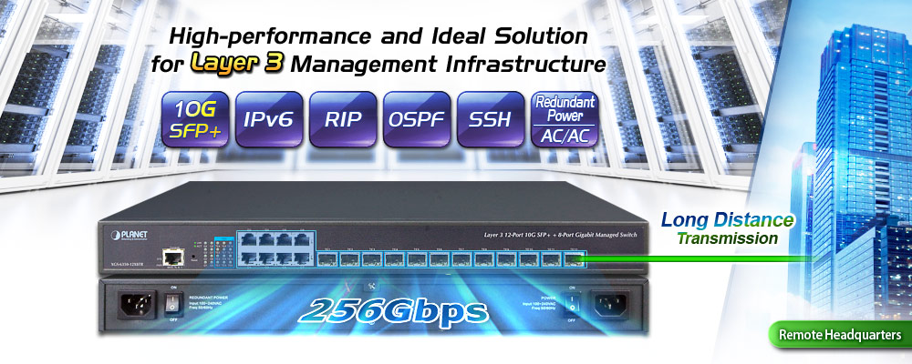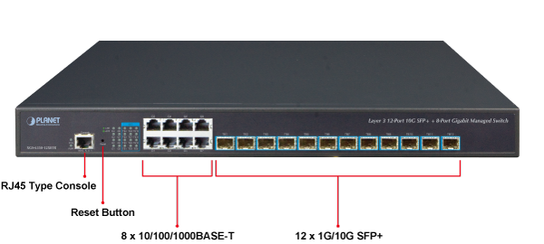 PLANET XGS-6350-12X8TR is a Layer 3 Managed Gigabit Switch that provides high-density performance by its Layer 3 10Gigabit routing with 12 SFP+ fiber interfaces and 8 Gigabit interfaces delivered in a rugged case. The administrator can flexibly choose the suitable SFP/SFP+ transceiver according to the transmission distance or the transmission speed required to extend the 10G network efficiently. Besides, with 176Gbps switching fabric, the XGS-6350-12X8TR can handle extremely large amounts of data in a secure topology linking to backbone or high capacity servers for enterprises, data centers, campuses and so on where VoIP, video streaming, and multicast applications are utilized.
