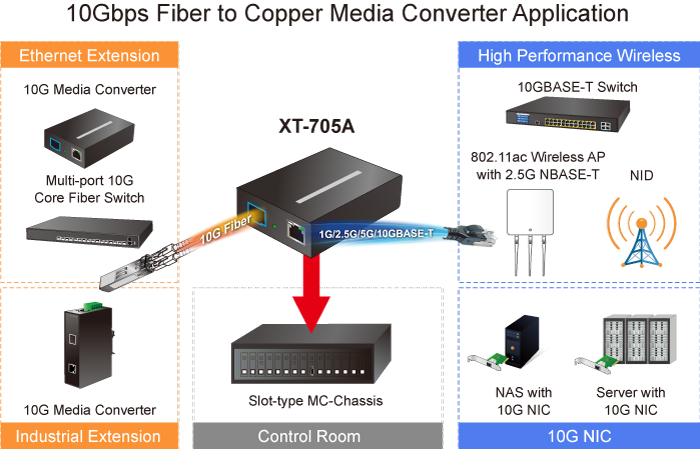 PLANET XT-705A Media Converter is equipped with one 10G/5G/2.5G/1G/100BASE-T auto-negotiation port and one 10GBASE-X SFP+ slot. It supports 10Gigabit Ethernet media conversion from copper 10GBASE-T to fiber multi-mode or single-mode, utilizing 10GBASE-SR or 10GBASE-LR SFP+ transceiver installed in the SFP+ slot to extend distances to servers, switches and patch panels. The deployment distance can be extended from 300 meters (multi-mode) to up to 60 kilometers (single-mode).They are designed for use in network environments where the ultra-high bandwidth provided by 10Gigabit Ethernet is required, for example, data center cloud computing, enterprise backbones, campus networks, and carrier infrastructure.