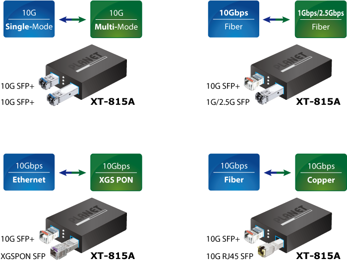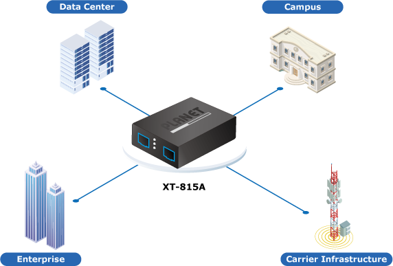 • product_editor_4418_tab_content: <strong>Ideal Applications for Enhanced Network Efficiency and Flexibility</strong> The XT-815A is perfect for network deployments with high bandwidth demands, including fast data transmission in data centers, efficient operations in enterprise backbones, long-distance fiber extension over kilometers, and telecom FTTH/FTTC network construction. Its easy installation and high-performance capabilities make the XT-815A an ideal choice for businesses and service providers alike. Thus, networks can be upgraded with the XT-815A for achieving 10G high speed, flexibility, and reliability. <img style="display: block; margin-left: auto; margin-right: auto;" src="https://www.planet.com.sa/planet-storage/2025/01/XT-815A-32.png" alt="" width="700" height="498" />   <strong>Perfect Applications for Advanced Networks</strong> The XT-815A is ideal for environments that demand high-performance, long-distance, and reliable networking solutions. With its 10G data transmission capabilities and easy installation, it is perfectly suited for deploying FTTH (Fiber to the Home) and FTTC (Fiber to the Curb) networks for ISPs, as well as FTTB (Fiber to the Building) networks for small- to medium-sized enterprises. Additionally, its ability to bridge 10GPON to 10G Ethernet and support a wide range of fiber transmission distances makes it a powerful tool for enterprise backbones, data centers, and campus-wide network extensions. Whether extending connectivity across a city or ensuring seamless data transmission within an enterprise, the XT-815A offers the flexibility and performance needed for modern network demands. <img style="display: block; margin-left: auto; margin-right: auto;" src="https://www.planet.com.sa/planet-storage/2025/01/XT-815A-11.png" alt="" width="572" height="387" />